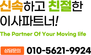 ONE-STOP MOVING SERVICE원룸이사, 용달이사, 포장이사 및 화물이사 등 각종이사 전문업체입니다. 고객 여러분의 믿음에보답하기 위하여 때묻지 않으려는처음마음 그대로의 마음과견리사의[見利思義]의 정신으로노력하겠습니다.인사말 바로가기 고객센터 상담안내궁금하신점은 언제든지 문의주세요.010-5621-9924 이사정보이사정보를 확인하세요! 공지사항새로운 소식을 확인하세요! Service이사서비스부산용달이사는 신속하고정확한 이사서비스를약속드립니다. 포장/반포장이사저렴한 비용으로 끝까지책임지는 서비스 원룸이사학생, 싱글 및 원룸/투룸에최적의 서비스 사무실이사보안과 고도의 숙련된 작업이편리한 서비스 용달이사일반이사, 자가이사용달서비스 도움이사용달기사는 도움을주는 이사서비스 용달/화물서비스기업화물, 일반화물이사화물 서비스